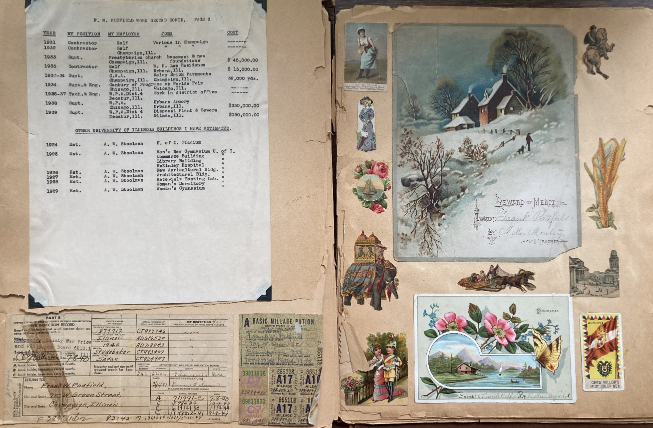 The Frank W. Padfield Scrapbook includes pasted sentimental materials from 1902 to 1949. This scrapbook is in fragile condition with many loose materials, and was digitized to provide access so that future physical handling does not cause damage. I really enjoyed processing this collection because of the broad range of materials included, such as postcards, newspaper clippings, photographs, graduation programs, diplomas, handwritten letters, maps, magazines, and even real pressed flowers. The flowers, unfortunately, had to be disposed of to protect the Archives from pest infestation. The creators of this scrapbook collection have brought together items that showcase their life of travel, educational and professional achievements, and love for their family. It allows users to connect with the creators more personally and find deeper meaning in how life was lived in the first half of the 20th century.