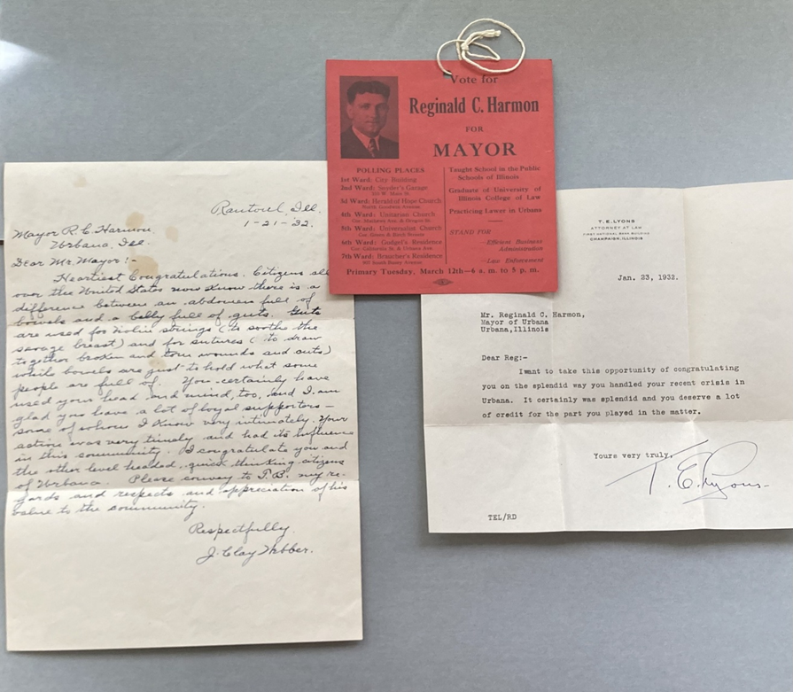 The Reginald C. Harmon Collection includes materials and documents from three main areas: Harmon's career as a lawyer, mayor, and military officer; the Harmon family; and local Urbana and Champaign ephemera. This collection allowed me to dive deeply into the life of Urbana's youngest mayor and how he rose to success in politics and the military. Though Reginald C. Harmon was only mayor of Urbana for four years (1929-1933), he gained national recognition in 1931 when he announced a banking moratorium for the city of Urbana to mitigate financial issues during the Great Depression. Closing the banks and reducing economic activity allowed them to rearrange their assets to avoid financial failure for the people of Urbana. In an interview from 1987, Harmon mentioned that he had no idea if this act would work. He said that because it worked, he was considered a hero (Series 2, Folder 10 if users are interested in reading the entire interview), and after Harmon's success in Urbana, other mayors across the country also announced banking holidays to avoid financial failure. Eventually, even President Franklin D. Roosevelt adopted this method. A folder of "Thank You" notes from local businesses and residents is addressed to Harmon in Series 2, Folder 2 of this collection. Reginald C. Harmon lived a long life after his time as mayor of Urbana. This collection allows users to take an in-depth look at a significant figure in Urbana's history and engage with primary source materials in the collection.