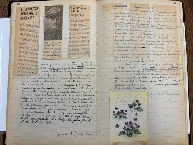 Page 98 in the Lovingfoss-Burr-Dilley Reunion minute book with notes of baby announcements, weddings, and family updates including a clipping announcing the death of Norman Lovingfoss who was killed in Germany during WWII.